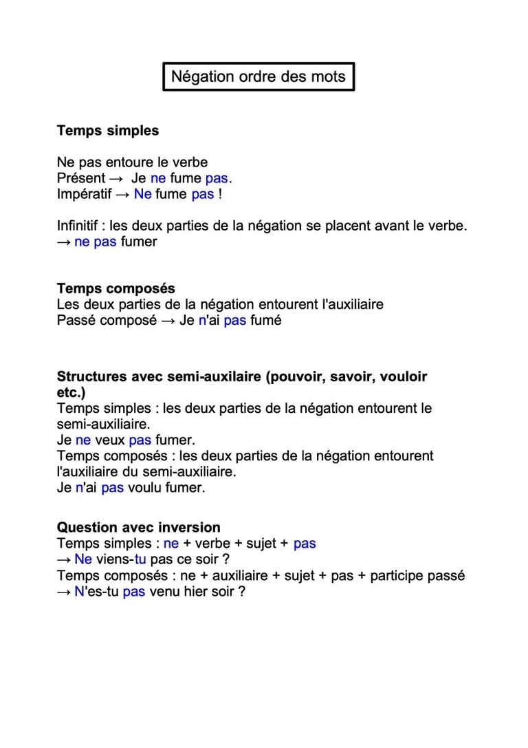 Apprenez les règles concernant l'ordre des mots dans les phrases négatives avec les verbes conjugués aux temps simples, avec l'infinitif, les temps composés, les structures avec semi-auxiliaire et les questions avec inversion.